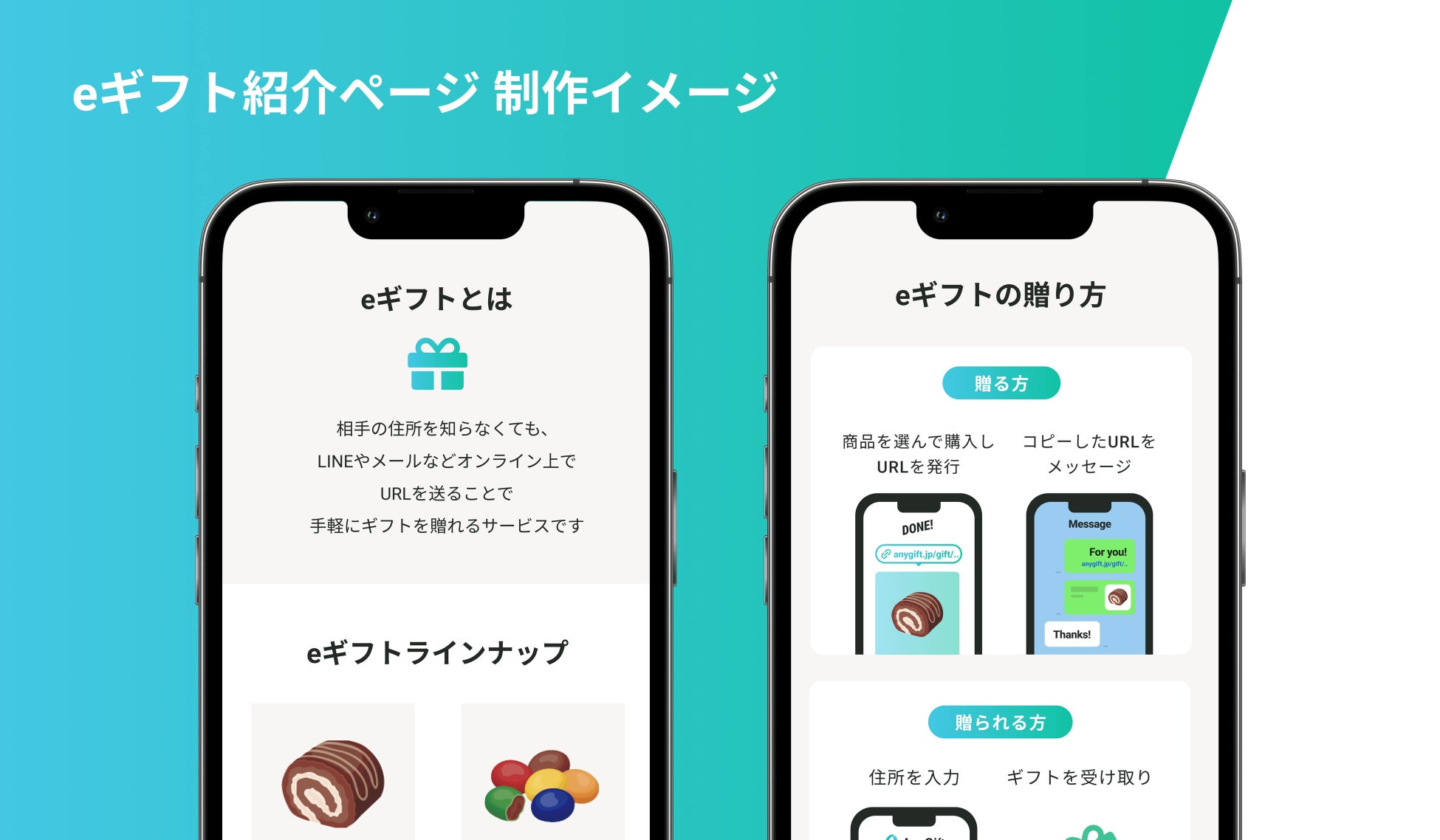 自社ECサイト上で、「eギフトとは何か?」「eギフト設定した商品をどう並べるか?」などをわかりやすく伝えたい場合、AnyGiftが専用ページの作成を無料で代行いたします。このページがあることで分かりやすくお客様に伝わり、eギフトの購入率が向上します。