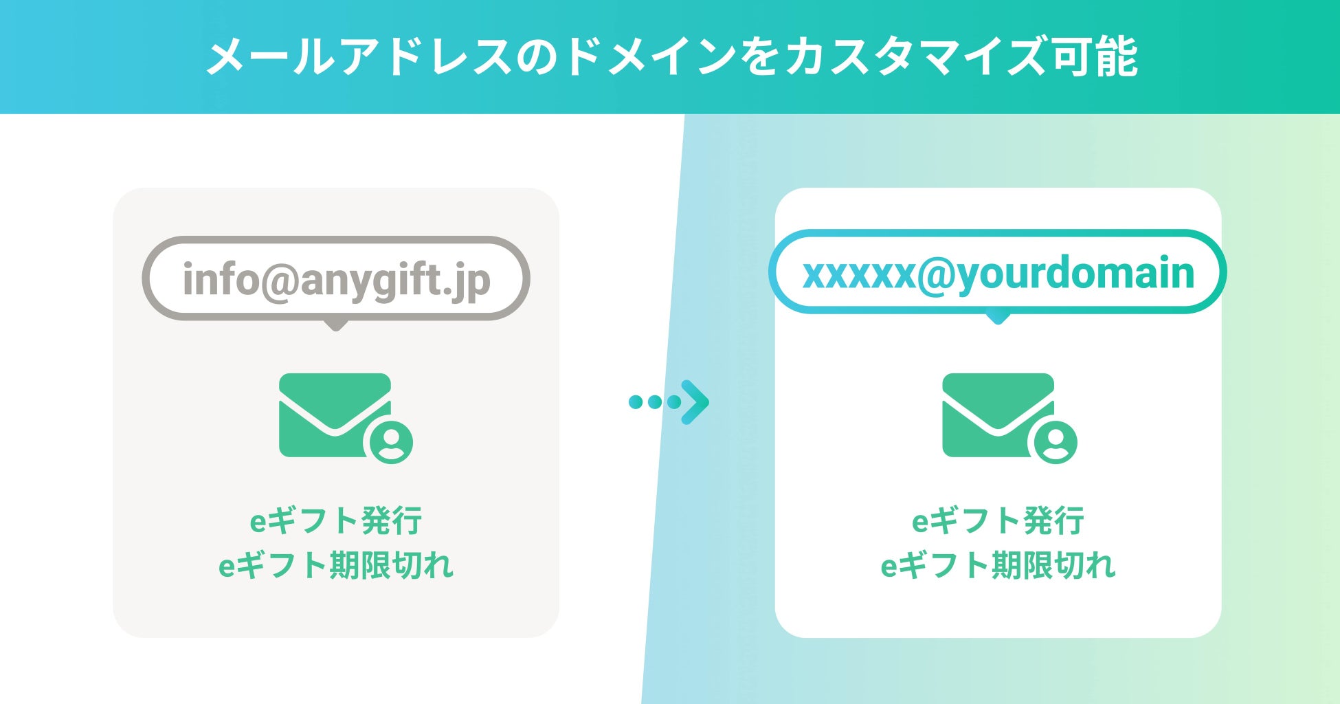 購入後に送信される「eギフトの受け取りURLが記載されたメール」や、「期限切れの催促メール」などを送るメールアドレスのドメインが、デフォルトでは「 info@anygift.jp」ですが、そのアドレスもお好きなアドレスに変更することが可能になります。
