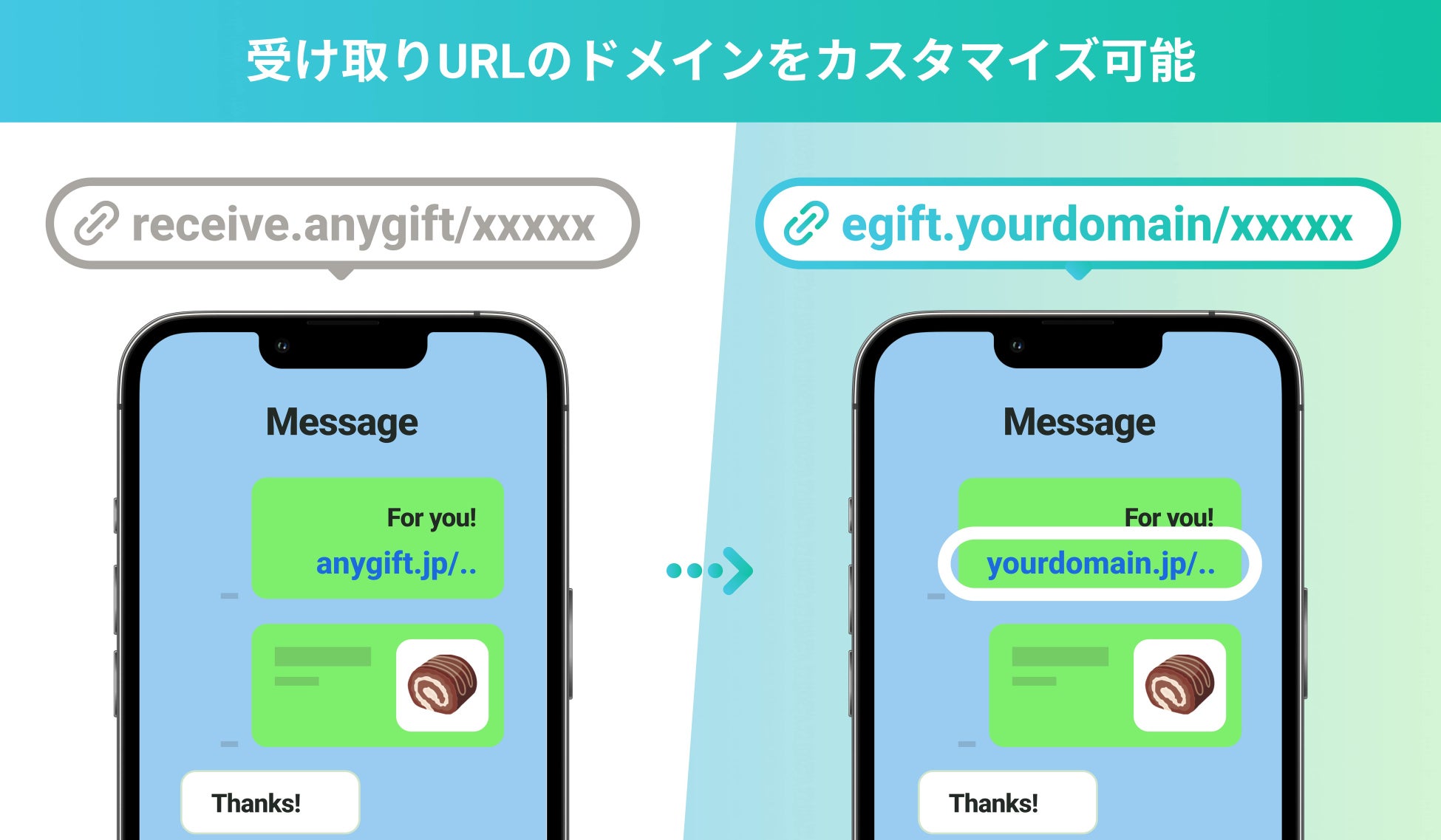 AnyGiftでは、eギフトを購入後に発行される受け取りURLのドメインがデフォルトでは 「anygift.jp」ですが、そのドメインを自社のドメインなど好きなものに変更することが可能になります。