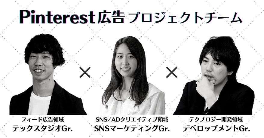 SNS広告の運用やクリエイティブの戦略を探求してきた「SNSマーケティング/ADクリエイティブ推進グループ」と、フィード広告領域で成果をあげてきた「テックスタジオグループ」。アドテクノロジー領域で様々なソリューションを研究・開発してきた「デベロップメントグループ」。これらのチームから組成された「 Pinterest アドプロジェクトチーム」が、カタログ実装・クリエイティブ制作・運用まで一貫して支援いたします。
