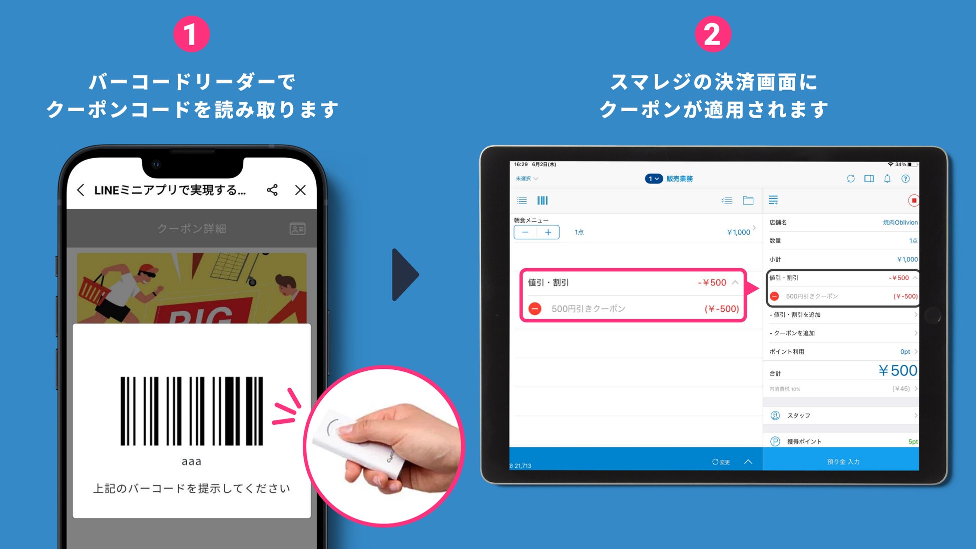 1.バーコードを読み取るだけで取引にクーポンを適用させることが可能