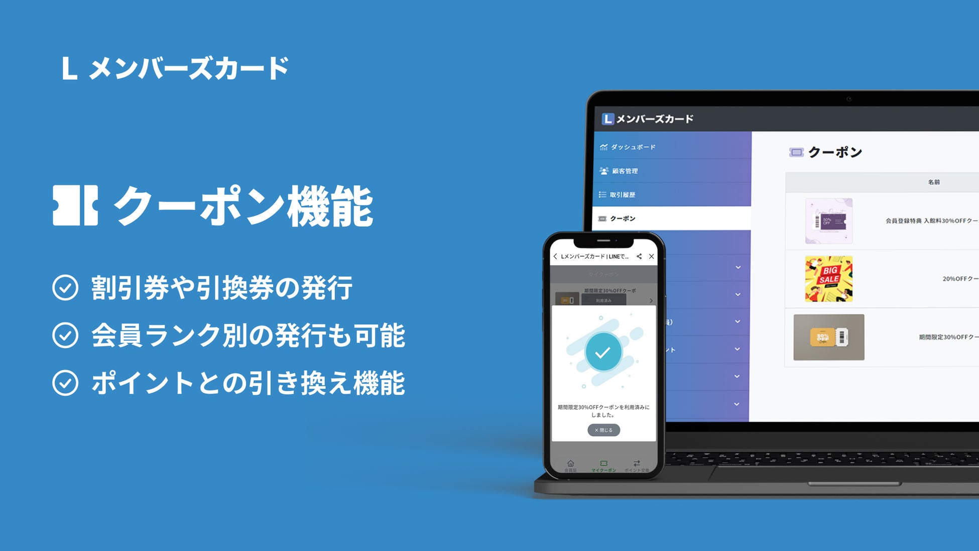 Lメンバーズカードの基本機能として利用いただけるクーポン機能では、店舗やサービスが発行する割引券や引換券を、お客様がLINEミニアプリ上で簡単に確認・利用することができます。管理画面上で簡単にクーポンを発行できるだけでなく、会員ランク別にクーポンを発行する機能・貯まったポイントとクーポンを引き換える機能もございます。