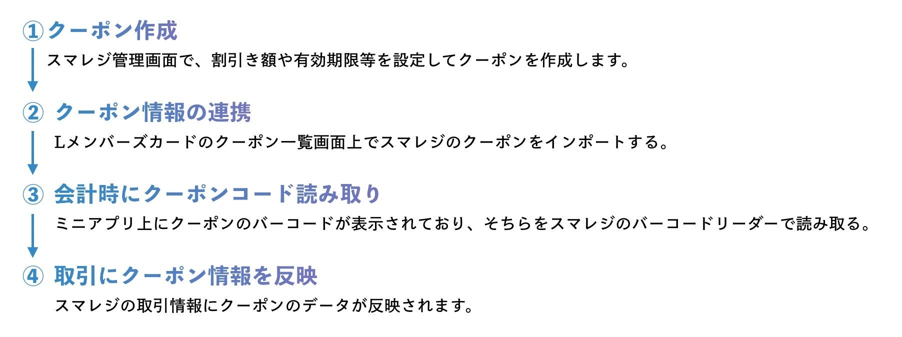 Lメンバーズカードで発行されたクーポンのバーコードを会計時に読み取ることで、スマレジのクーポンとして割引き処理が行われます。スマレジとの連携の流れは以下の通りです。