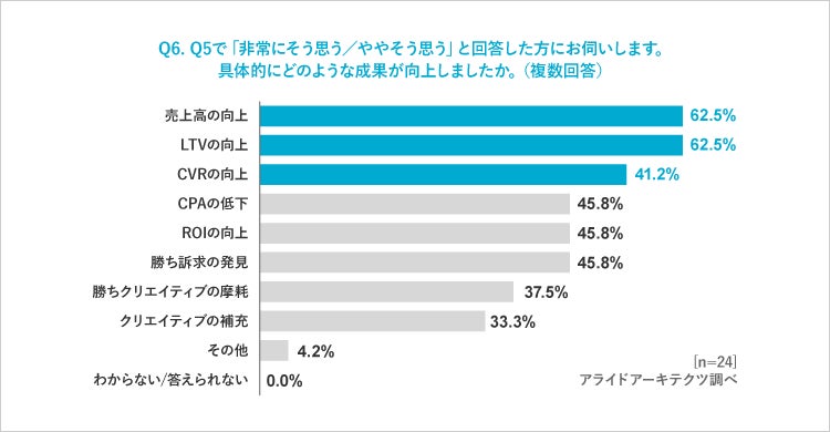 アップデート・変化させている施策を「UGCの活用」と回答した方に対して、「UGCの活用によって施策成果が向上したか」について聞いたところ、96%が「向上した」と回答しました。さらに、「非常にそう思う」、「ややそう思う」と回答した方に対して「具体的にどのような成果が向上したか」について聞いたところ、62.5%が「売上高の向上」「LTVの向上」と回答したことから、UGC施策は「売上」やサブスクビジネスで重要視される「継続率」を向上させる施策として評価されていることが分かりました。また、「CVRの向上(54.2%)」が続いていることから、CPMの高騰から獲得効率の改善が急務となる中でUGCの活用に効果を感じた方が多いことがわかります。これらの回答から、UGCは新規顧客の獲得から既存顧客の維持・継続まで複数のフェーズで活用されていることがわかります。