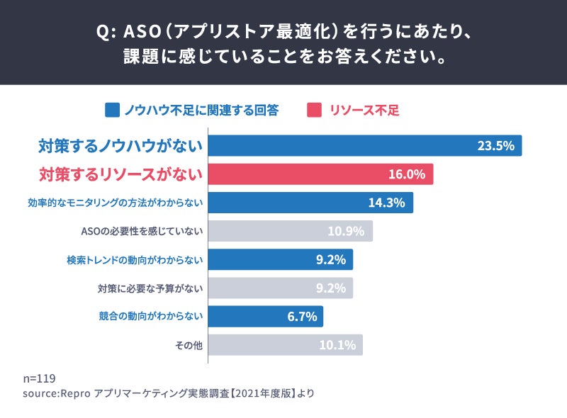 当社が2021年12月に実施したアンケート調査(※1)では、ASO対策にあたる課題としてノウハウの不足に加え、対策するためのリソースが不足しているとの結果が顕著に出ています。