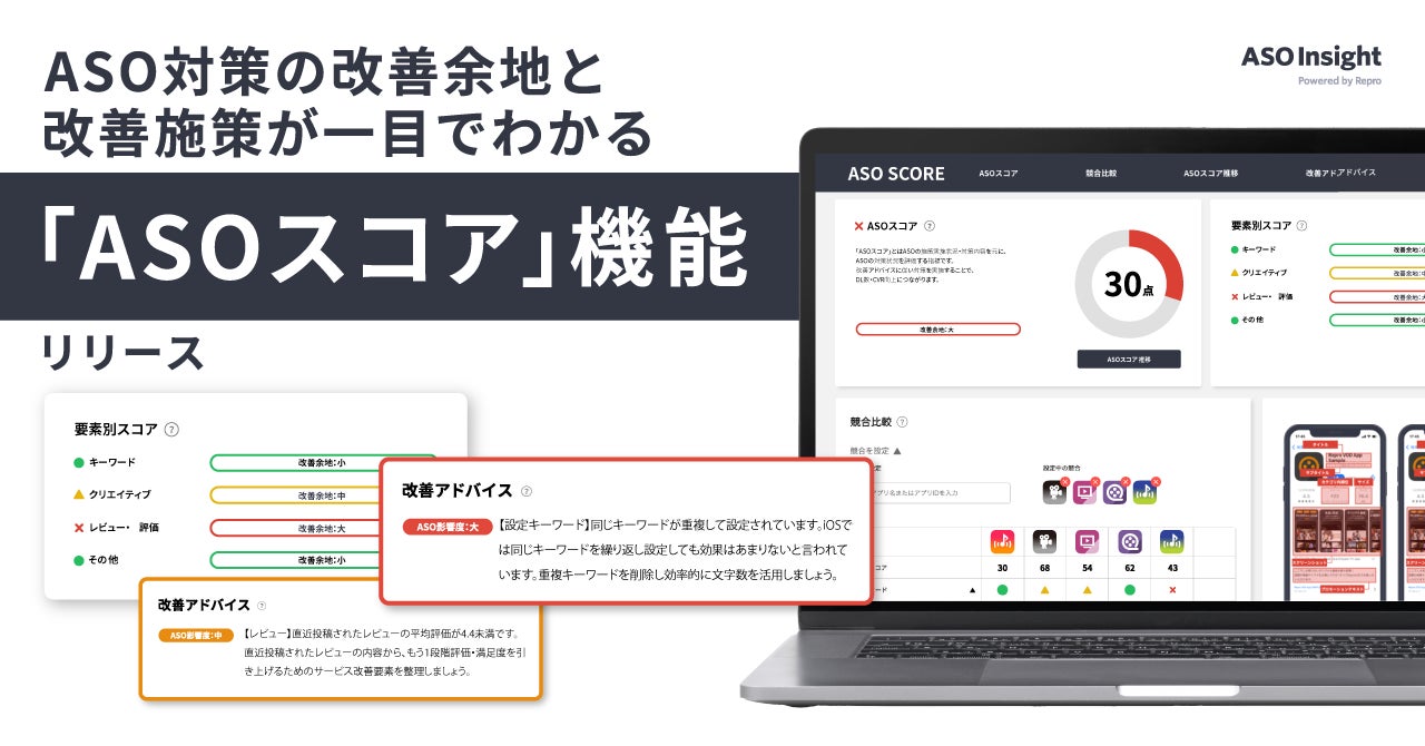 世界66か国7,300以上の導入実績を持つCE(カスタマーエンゲージメント)プラットフォーム「Repro(リプロ)」を提供するRepro株式会社(以下、当社)は、ASO(アプリストア最適化)支援ツール「ASO Insight」がASO施策の実施状況やアプリストアの設定内容から客観的な評価指標を自動算出し、各要素区分別の改善余地の可視化と改善施策を自動提案する新機能「ASOスコア」をリリースしたことをお知らせいたします。