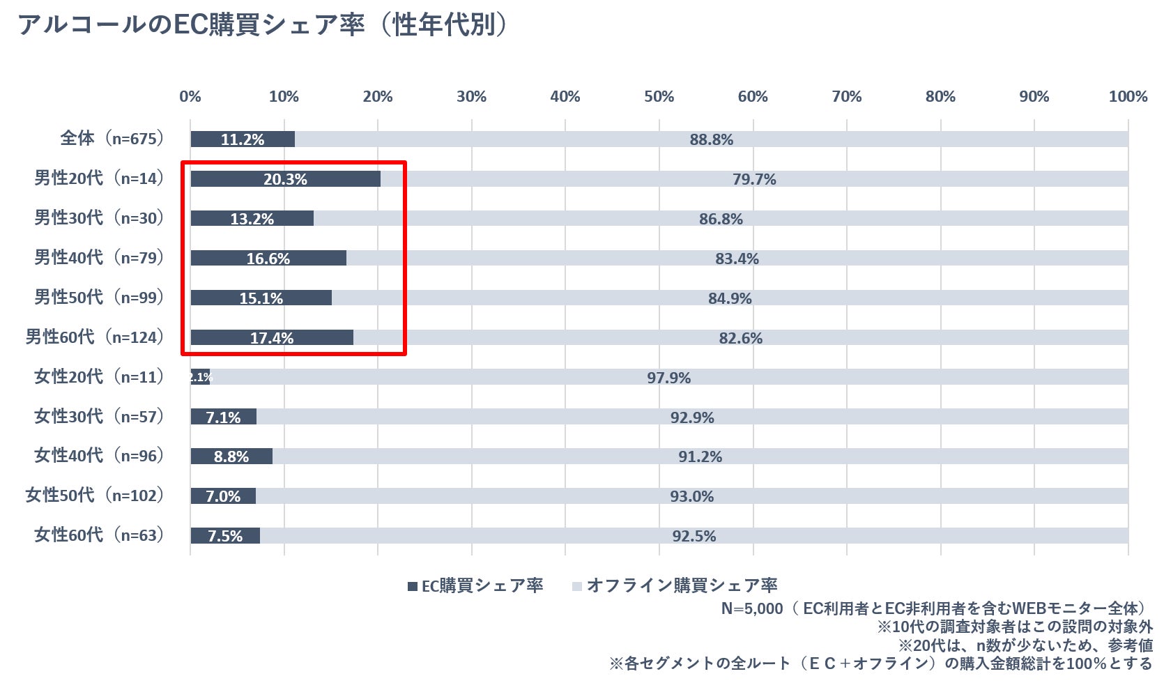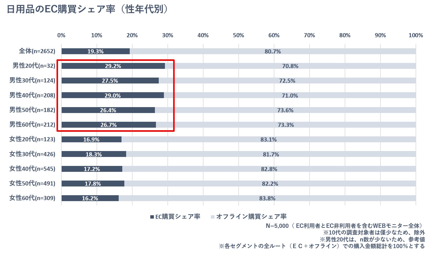 これらの結果から、EC生活者にとって、健康食品・飲料などの特定のジャンルにおいてはECでの購入が一般的な行動になりつつあるようだ。また、ボディケア・ヘアケアや日用品、飲料、アルコールといった、従来はスーパーやコンビニなどのリアルリテールで購入されてきた商品の購入チャネルが、男性を中心にECにシフトしつつあることがうかがえる。
