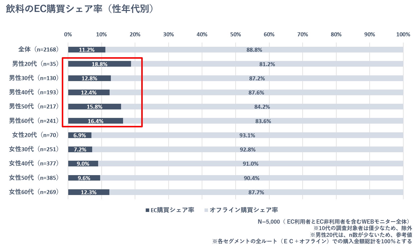 購入チャネルがECにシフトしているジャンルが浮き彫りに。また、性年代別でEC購買シェア率を分析すると、ボディケア・ヘアケア、日用品、飲料、アルコールは、女性よりも男性においてECシフトが進んでいる。