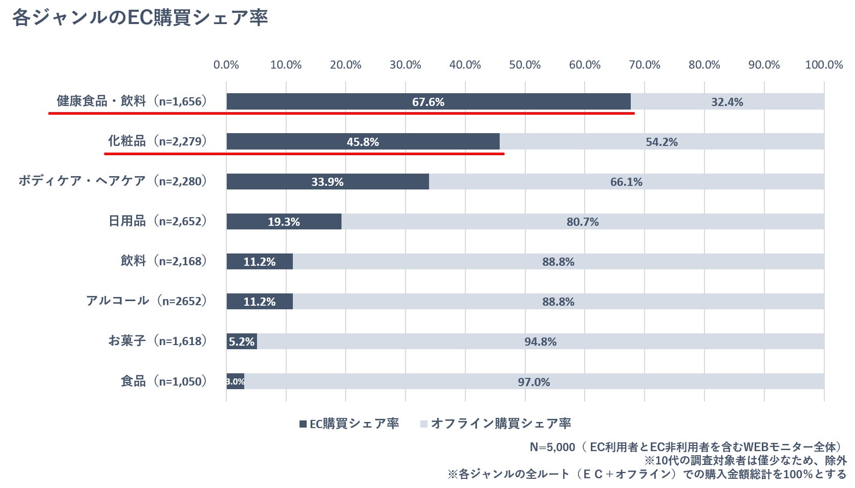 ・EC購買シェア率(※2)が高いジャンルは、健康食品・飲料(67.6%)や化粧品(45.8%)