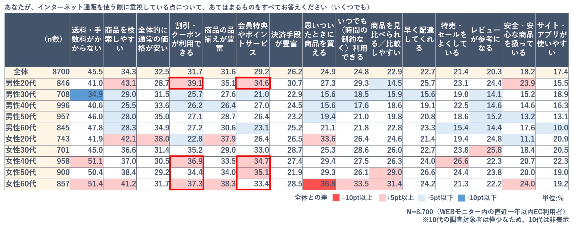 加えて、性年代別にEC利用時の重視点を分析すると、男性20代と女性40代以降において、「割引が利用できる」「ポイントサービスがある」と答えた人の割合は全体比で高くなったため、男性20代と女性40代以降は、“お得感”を重視していると推測される。