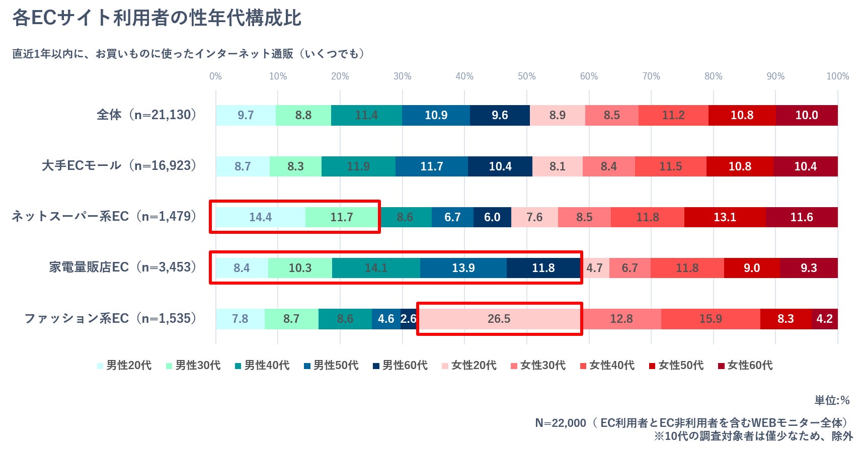 大手ECモール利用者の性年代構成比は、全体と同じ傾向に。家電量販店利用者の性年代構成比をみてみると、男性の割合が全体比で高い。ファッション系EC利用者の性年代構成比は、女性の割合が全体比で高く、特に女性20代の割合が全体比で高くなることがわかった。また、ネットスーパー系EC利用者の性年代別構成比をみてみると、男性20代は14.4%、男性30代は11.7%(全体との差分はそれぞれ+4.7pt、+2.9pt)と、男性若年層の割合が比較的高く、また全体との差分が大きいことから、男性若年層を中心にネットスーパー系ECの利用が進んでいることが推測される。