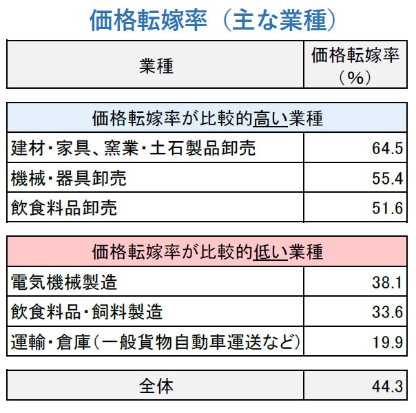 一方で、特に原油価格の高騰の影響を受けているトラック運送などを含む「運輸・倉庫」は19.9%と全体を24.4ポイント下回った。また、小麦価格や輸送費などの上昇に直面している「飲食料品・飼料製造」(33.6%)も価格転嫁が進んでいない。