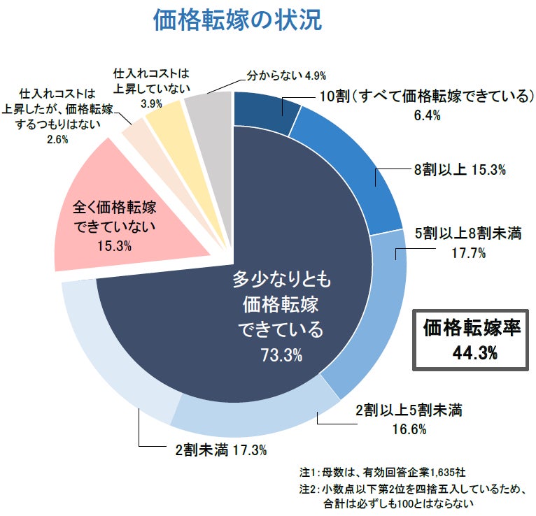 - 自社の主な商品・サービスにおいて、仕入れコストの上昇分を販売価格やサービス料金に『多少なりとも転嫁できている』企業は73.3%となった。一方で、『全く価格転嫁できていない』企業は15.3%だった