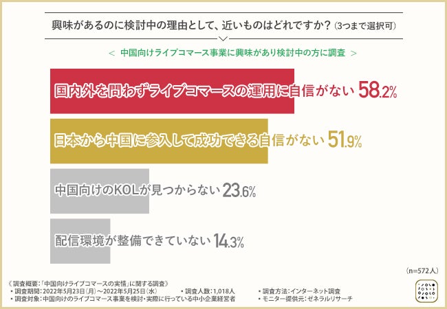 最初の質問で『非常に興味があり検討している』と回答した方に、「興味があるのに検討中の理由として、近いものはどれですか?(3つまで選択可)」と質問したところ、『国内外を問わずライブコマースの運用に自信がない(58.2%)』と回答した方が最も多く、次いで『日本から中国に参入して成功できる自信がない(ノウハウがないなど)(51.9%)』『中国向けのKOLが見つからない(23.6%)』『配信環境が整備できていない(14.3%)』と続きました。