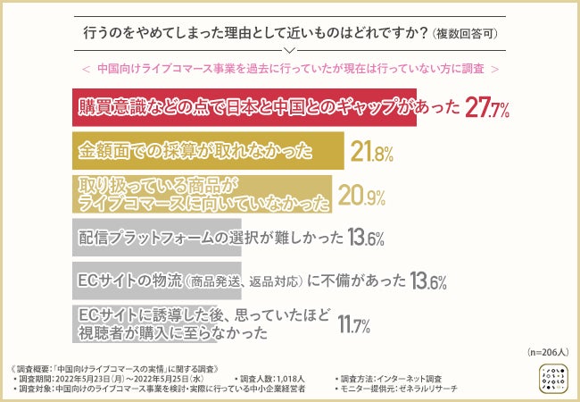 比較的に多いのは、興味はあるもののライブコマースを運用することに自信がないこと、中国でライブコマース事業を行うことに自信がない(ノウハウがない)といった理由があるため、なかなかその先へ踏み出せないようです。