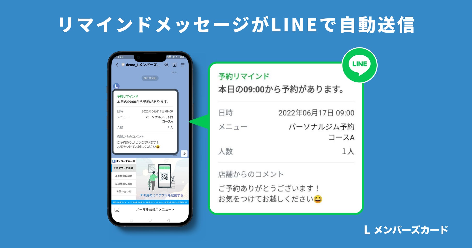Lメンバーズカードの「カレンダー予約機能」は、LINEミニアプリ上で完結する予約システムです。予約希望者はLINE上で空き状況がリアルタイムにわかるようになり、24時間365日いつでも予約できます。また、予約当日の朝8時に自動リマインドメッセージも送信されるため、予約に関する店舗側の対応がほぼ不要になります。