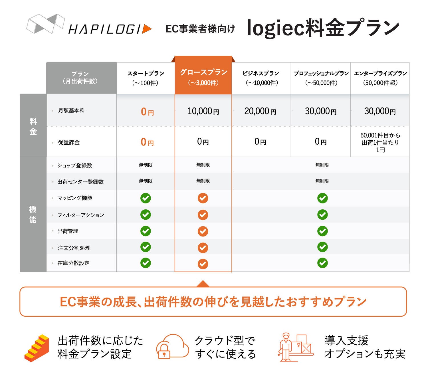出荷件数に応じて選択できる新料金プランへ刷新、導入支援に関するオプション(別料金)もご選択いただけるようになり、自由度が高いことが特徴です。