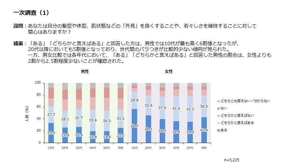 調査対象を10代から50代の男女とし、年齢や性別に基づき群間比較した結果、「外見を良くすることや、若々しさを維持すること」に対して関心を示す男性は各世代で5割から6割程度となり、世代間のバラつきが比較的少ないことが確認されました。