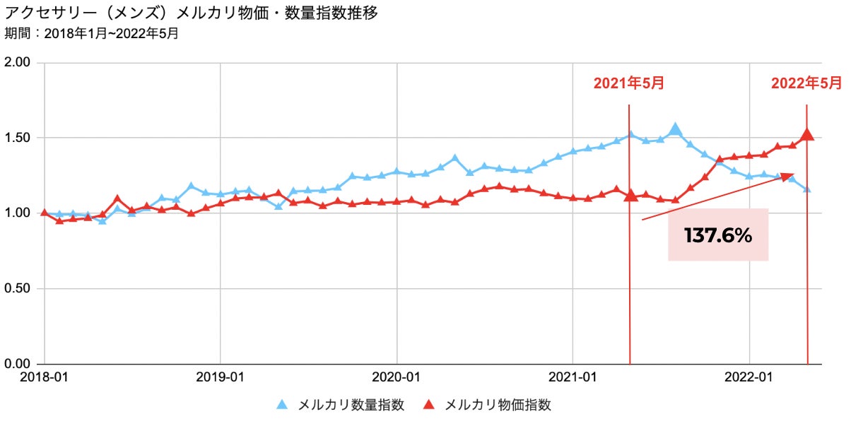 また、「メルカリ」上で「needles アクセサリー」の検索率(※3)も約1.8倍上昇するなど、直近では外に出る機会も増え、需要の高まりから価格指数が大幅に伸びたと見られます。