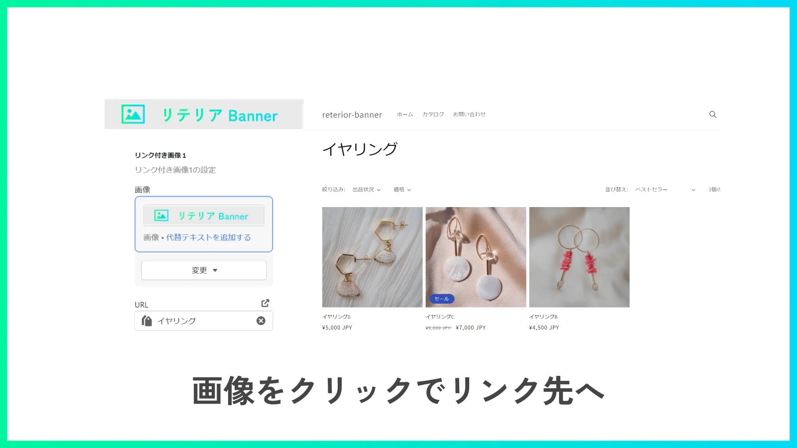 「らくらくバナー設置アプリ|リテリア Banner」は、画像をクリックすることでリンク先に誘導できます。リンクの設定方法は shopify 内のページから選択する、URL を直接設定するの 2 通りあります。