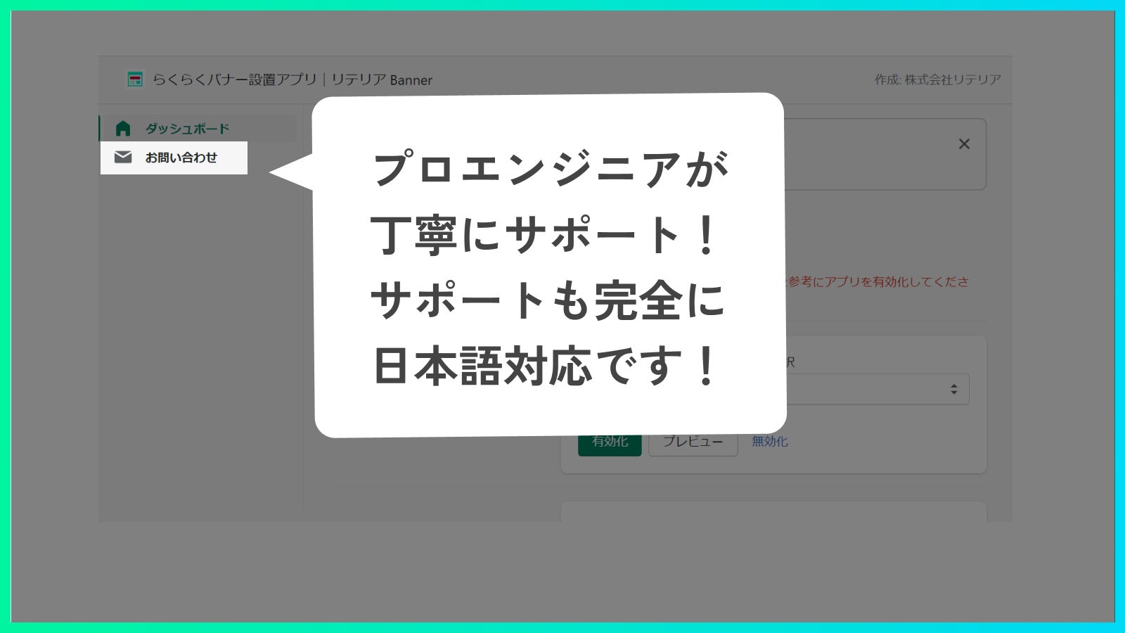 「らくらくバナー設置アプリ|リテリア Banner」は、日本製のShopifyアプリであるため、サポートも日本語です。日本のエンジニアがアプリの導入を丁寧にサポートします。