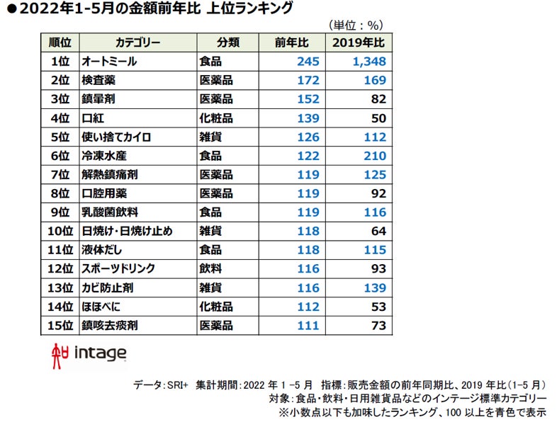 株式会社インテージ(本社:東京都千代田区、代表取締役社長:檜垣 歩、以下インテージ)は、全国約6,000店舗より収集している小売店販売データ、SRI+®(全国小売店パネル調査)をもとに、日用消費財の中で何がより売れたかを、推定販売金額の伸びから振り返る「2022年、上半期売れたものランキング」を発表しました。(データは5月分まで使用)