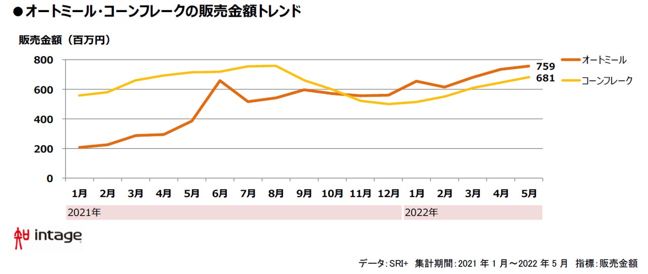 新型コロナ3年目の上半期、1位となったのはオートミールでした。昨年同時期比で245%と今年に入っても大幅に数字を伸ばしましたが、コロナ前の2019年と比べると販売金額は驚きの1,348%にまで達しています。低カロリーで豊富に食物繊維を含むなど健康・美容の需要にこたえました。爆発的な広がりを見せたオートミールですが、日本の朝食の顔でもあったコーンフレークを昨年11月に販売金額で逆転しています(図表2)。いかに急激に日本の食卓で存在感を大きくしていったかが分かります。