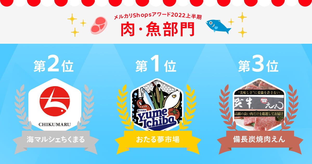 | 選定基準:農作物部門 / 肉・魚部門 / スイーツ部門 ・「良かった」の評価とレビューコメント数が多いショップ ・商品の販売数の多いショップ ベストリピーター部門 ・2回以上購入した人がもっとも多い商品を販売するショップ ベストエピソード部門 / サステナブル部門 ・「メルカリShops」での販売体験を公募の中から選出 対象期間:2022年1月1日〜5月25日 |