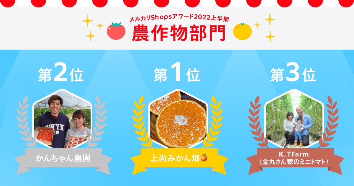 月間利用者数2,000万人を超える「メルカリ」で事業者として商品が販売できる「メルカリShops」において、2022年1月以降、お客さまから高い評価を得ているショップや、リピート注文を多く受けているショップなどを表彰するアワードです。「メルカリShops」では、野菜や果物など農作物を産地直送で届けてくださった生産者の皆さまや、お客さまとハートフルなエピソードを紡いだ皆さまを表彰することで、生産者やクリエイター、その他受賞された出店者を応援してまいります。