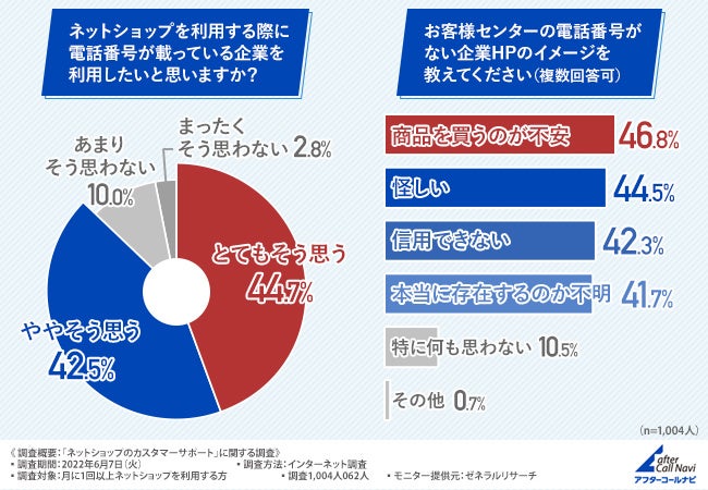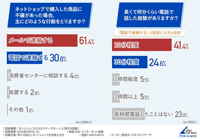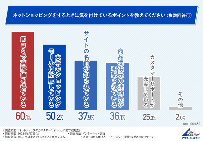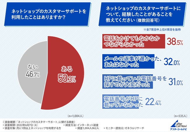 アフターコールナビ株式会社(本社所在地:東京都江東区)は、月に1回以上ネットショップを利用する方を対象に、「ネットショップのカスタマーサポート」に関する調査を実施しました。