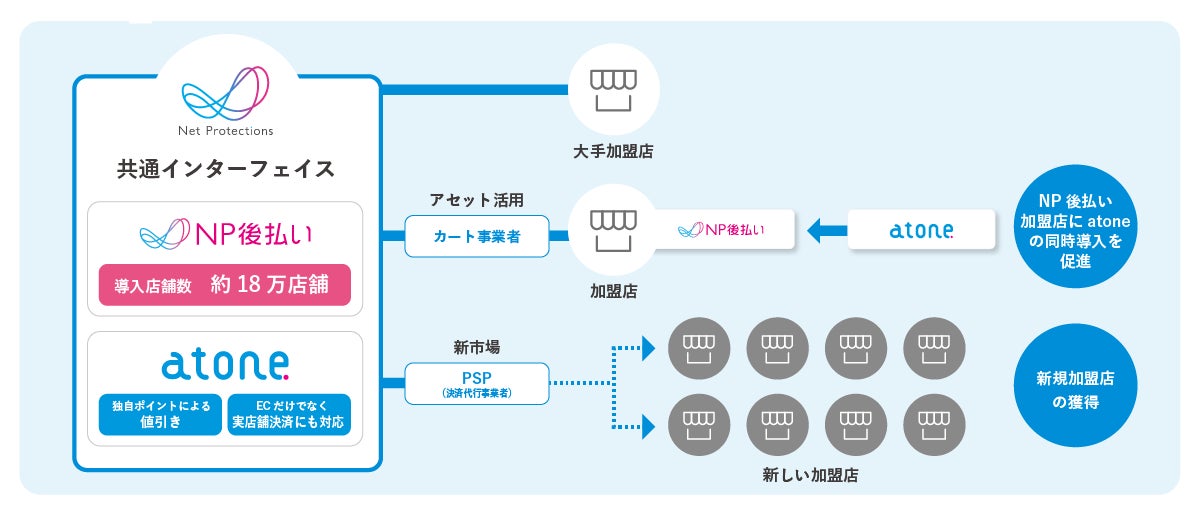 本日2022年6月28日(火)より公式展開を開始いたします。まずはショッピングカート・PSP(決済代行事業者)との連携を強化していくことで、多くの事業者様に「後払い共通IF」をご利用いただける基盤を作ります。その後、既存の「NP後払い」加盟店約18万店(※3)に「atone」の併用を促進し、「後払い共通IF」の提供価値を多くの事業者様に届けていきます。