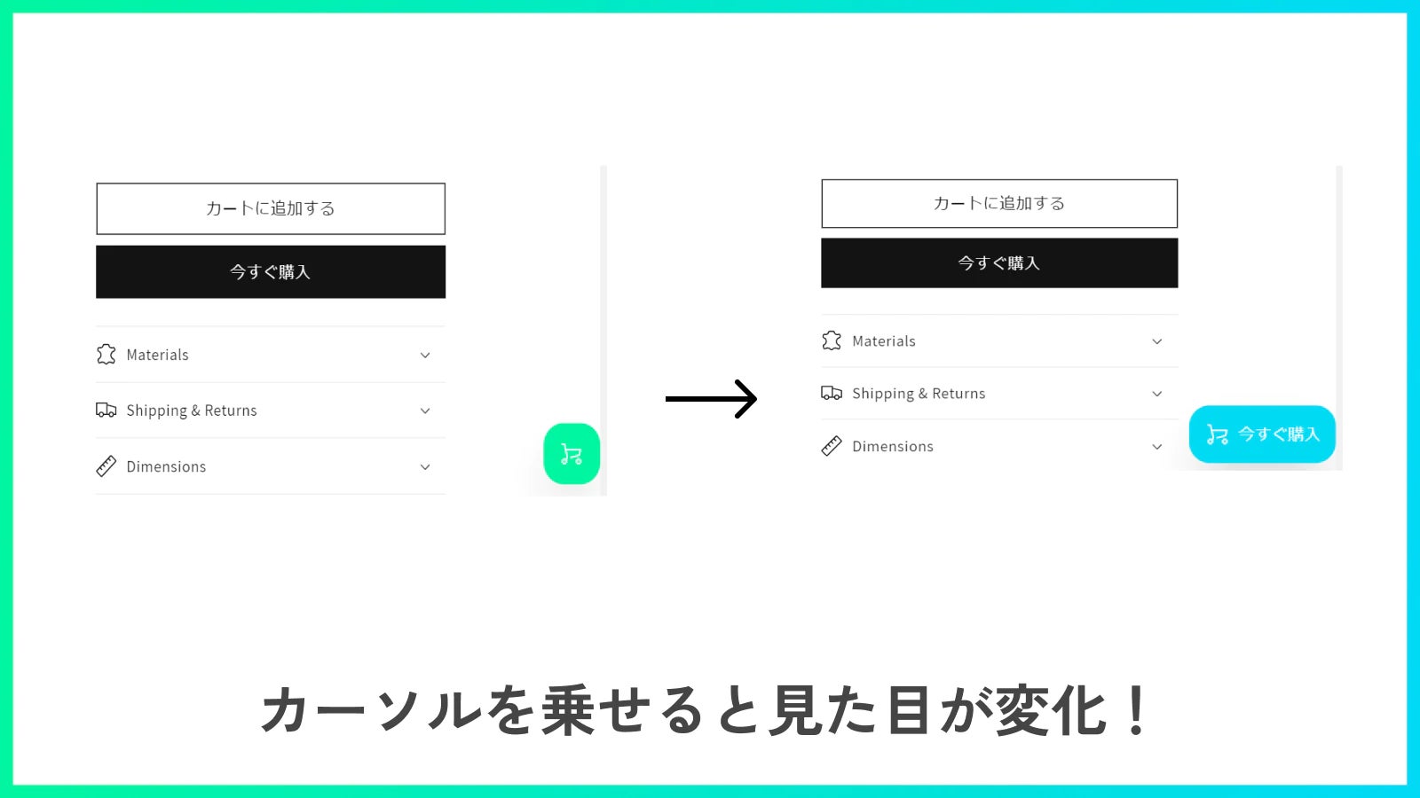 「追従購入ボタンらくらく挿入|リテリア Buy Button」で挿入した追従購入ボタンは、カーソルを乗せると見た目が変化します。リッチな見た目の追従購入ボタンを、ストアに挿入しましょう。