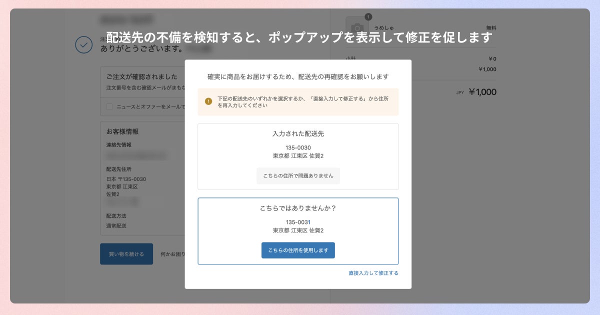本アプリは、ショップでの注文完了後に配送先住所をチェックし、不備がある場合にポップアップを表示することで、お客様に住所の再確認と修正を促すことができます。
