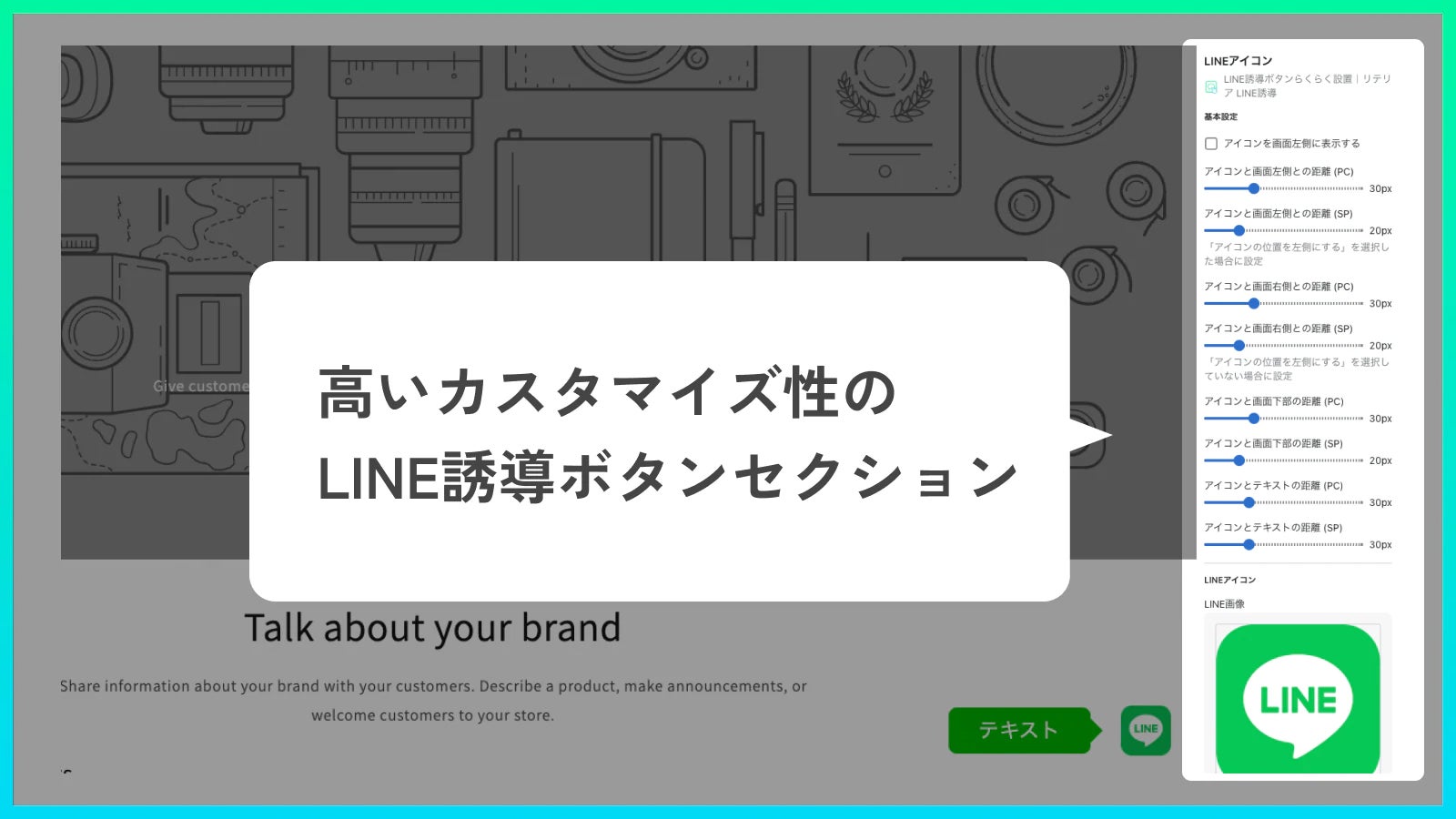 「LINE誘導ボタンらくらく設置|リテリア LINE誘導」は、高いカスタマイズ性のLINE誘導アイコンをShopifyストアに挿入することができます。テキストや吹き出しの背景色・文字のサイズや位置なども自由自在にカスタマイズすることが可能です。LINE誘導ボタンをShopifyストアに挿入して、集客率を高めましょう。