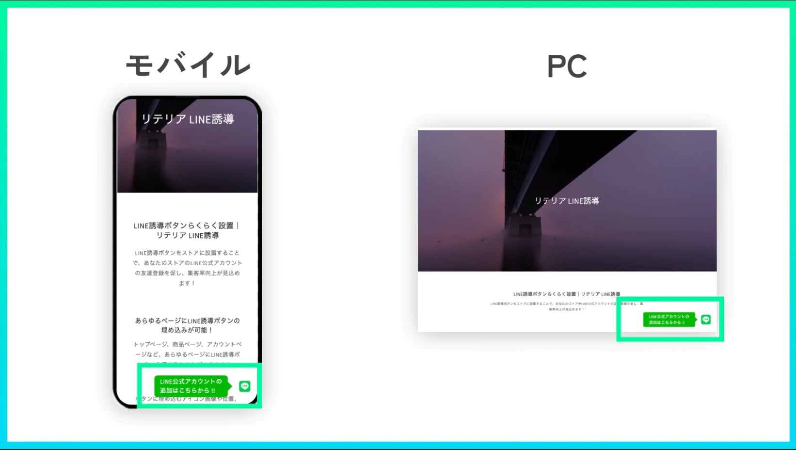 「LINE誘導ボタンらくらく設置|リテリア LINE誘導」は、モバイル時とPC時のデザインに完全対応しています。