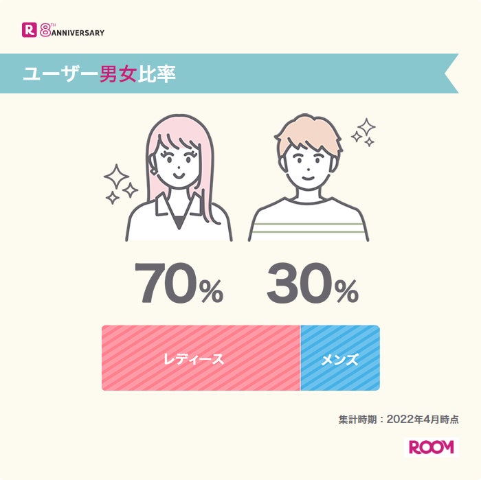 「ROOM」ユーザーの男女比率(注2)は、女性約70%に対し、男性約30%。女性が利用者の多くを占めますが、近年では、男性ならではの視点で、暮らしや趣味のアイテムを投稿する男性ユーザーも増加傾向で、男性ユーザーの支持を集めています。