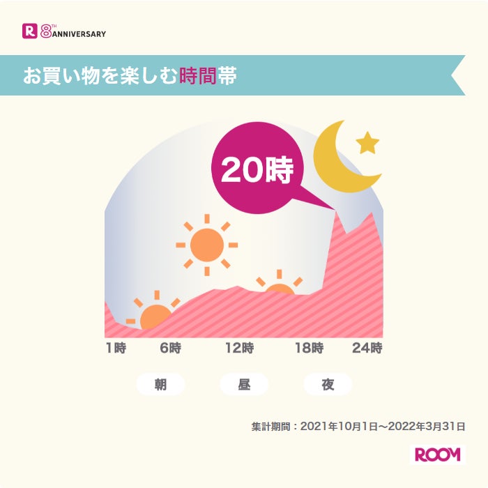 「ROOM」の閲覧ユーザーが最も多くなる時間帯(注4)は20時(夜8時)以降です。一日の終わりの時間に情報収集をしたり、お買い物を楽しんだりするユーザーが多いことがわかります。
