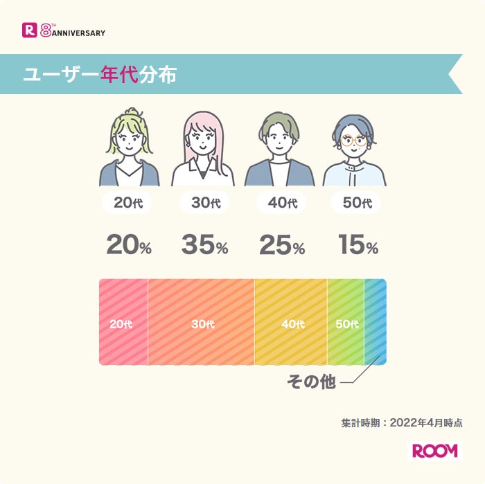 年代別(注3)では、30代のユーザーが一番多く約35%、次いで40代が約25%、20代が約20%、50代が約15%と、幅広い世代のお買い物好きが「ROOM」を愛用しています。