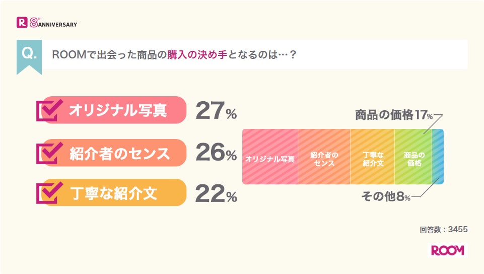 ユーザーが検索するワードのランキング(注6)においては、「オリジナル写真」が1位となっており、アンケートでも「ROOM」で出会った商品の購入の決め手となるのは「オリジナル写真」(27%)が最多の回答となっています。他に購入の決め手となるのは、「紹介者のセンス」(26%)や「丁寧な紹介文」(23%)と答えた回答者が多く、他のユーザーの投稿した写真により、リアルな使用感を知るために「ROOM」を役立てるユーザーが多いことがわかりました。