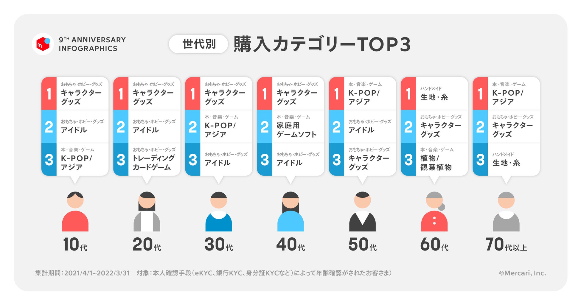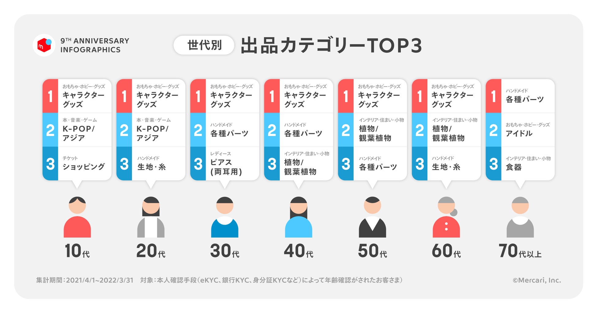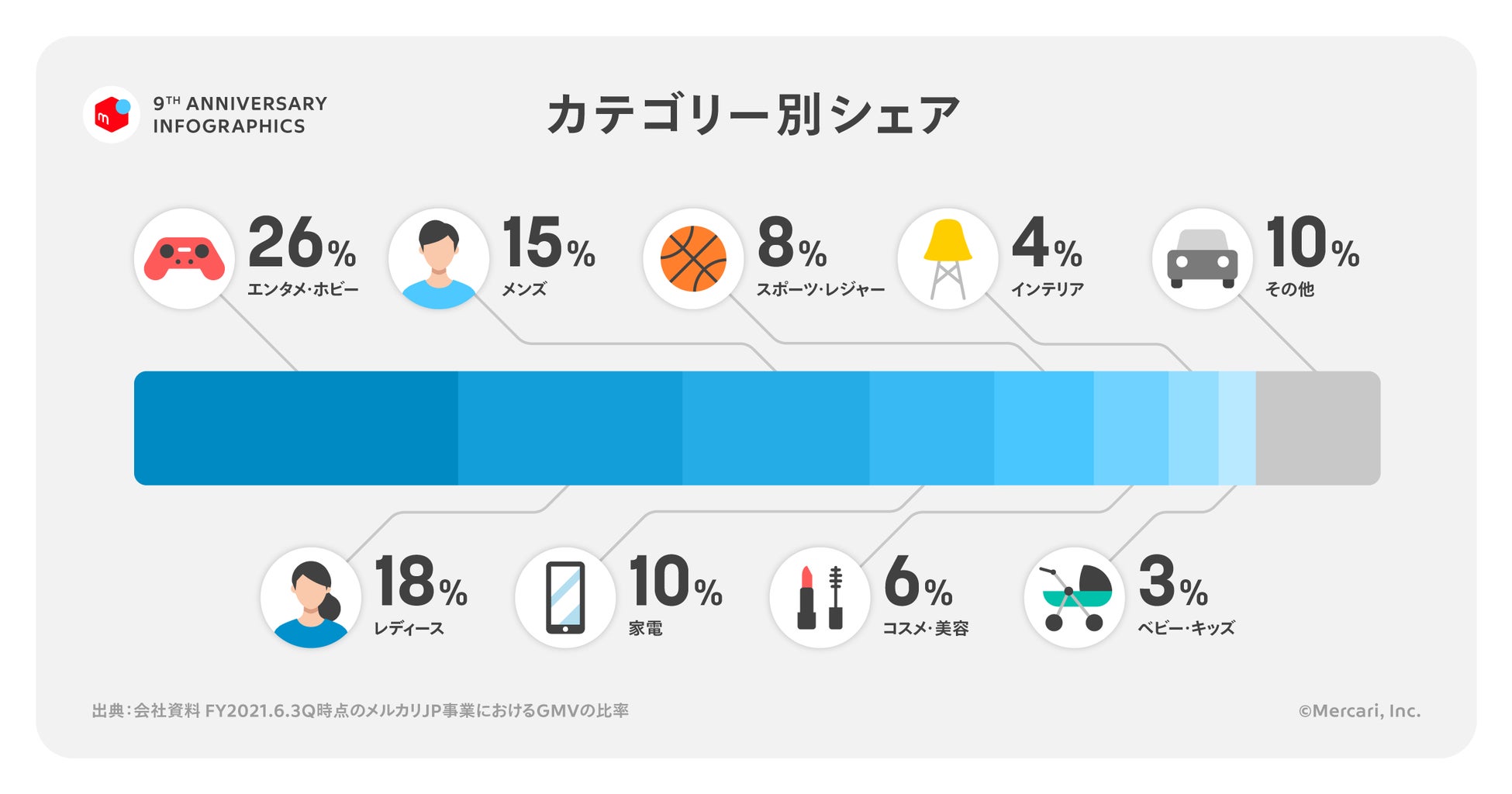 株式会社メルカリは、7月2日を以てフリマアプリ「メルカリ」のサービス開始9周年を迎えました。これを記念して、1年のあゆみを振り返る「メルカリ サービス開始9周年」インフォグラフィックスを公開しました。