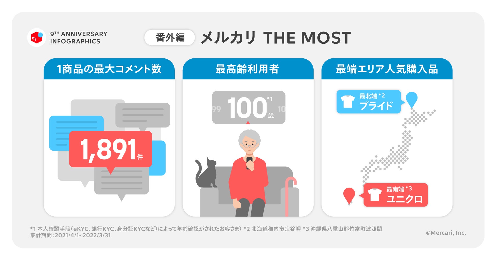 メルカリにまつわる最上級の数値をピックアップ。「メルカリ」のコメント欄で最もやり取りが行われた数は最大1,891件、最高齢のお客さまの年齢は100歳でした。