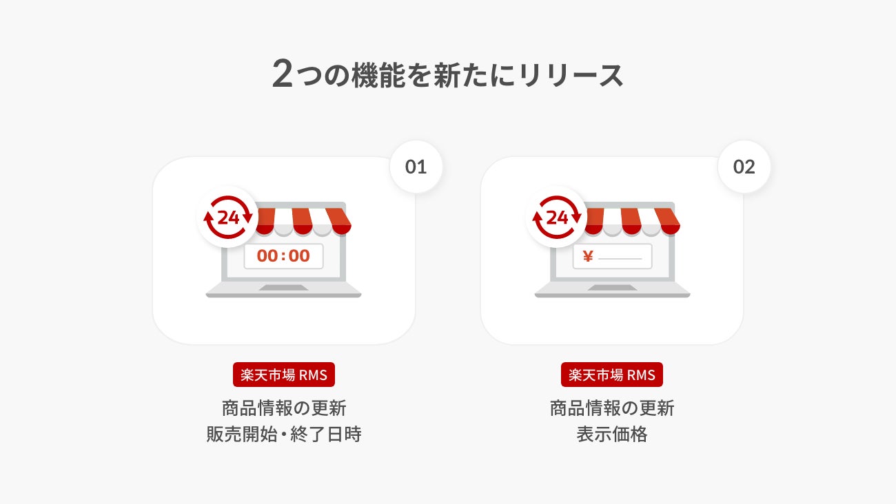 「楽天市場」の商品ページにおいて、「共通説明文(大)」は文章と画像を挿入できるため、セール期間中にセール対象商品をアピールする目的で使われています。一方で、「共通説明文(大)」の更新作業は商品ページの数だけ発生し、さらにセールの開始直前と終了直後で 2 回発生するため、手動での更新作業には手間がかかります。また、セールの終了時刻が深夜の場合は、深夜に作業が発生するため事業者の負担は少なくありません。今回リリースする新しい機能を使うことで、Google スプレッドシートをもとに「共通説明文(大)」の自動更新が可能になるため、作業担当者の負担が減るだけでなく、深夜作業のため割増で発生していた残業代等の人件費を削減することができます。