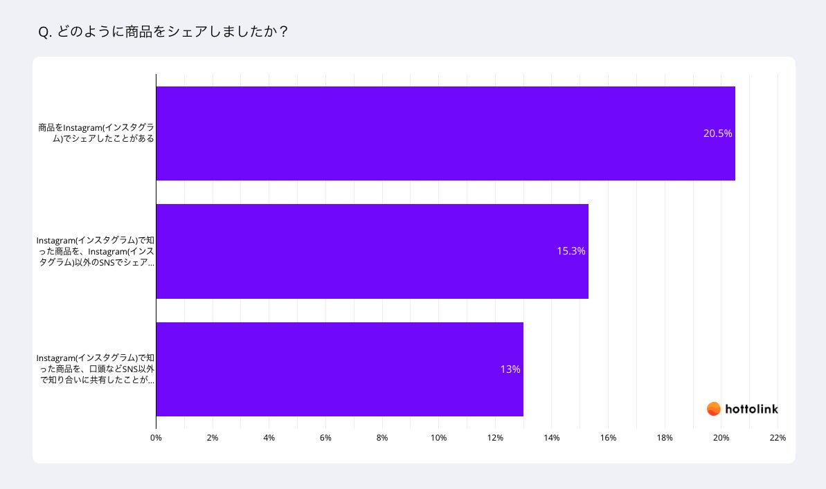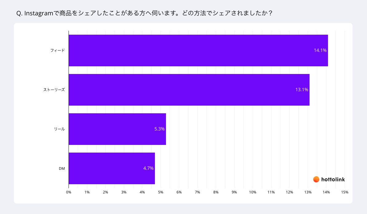 また、Instagram上でのシェアについては、フィードとストーリーズがもっとも多い結果となりました。今後は、リールの活用が活発化すれば、短尺動画を用いたシェアが増えていくことも推測されます。