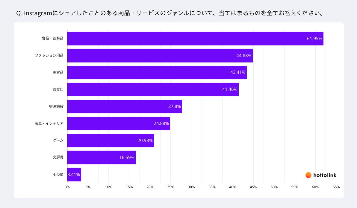 シェアしたことがある商品・サービスジャンルで最も多かったのは食品・飲料品であり、続いてファッション用品・美容品・飲食店が上位を占めました。