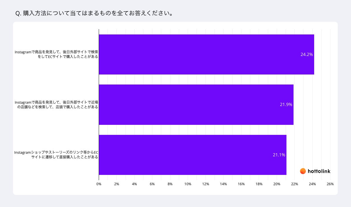 購入経路としては、「後日外部サイトで検索をしてECサイトで購入した」がもっとも多い結果となりました。Instagramからの直接遷移による購買だけでなく、間接的な指名検索への影響を考慮することが重要であるとわかります。
