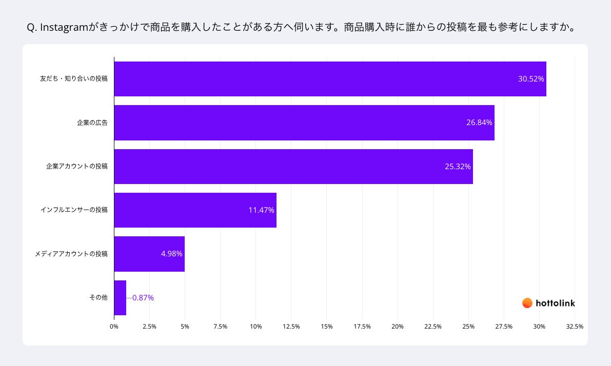 Instagramの主な使用用途が「友だち・知り合いとのコミュニケーション」だったことも踏まえ、信頼できる身近な友人からの推奨が、購買に大きな影響を与えていることがわかります。一般ユーザーのクチコミをInstagram上で増やすことが、購買につなげる重要なポイントになるでしょう。
