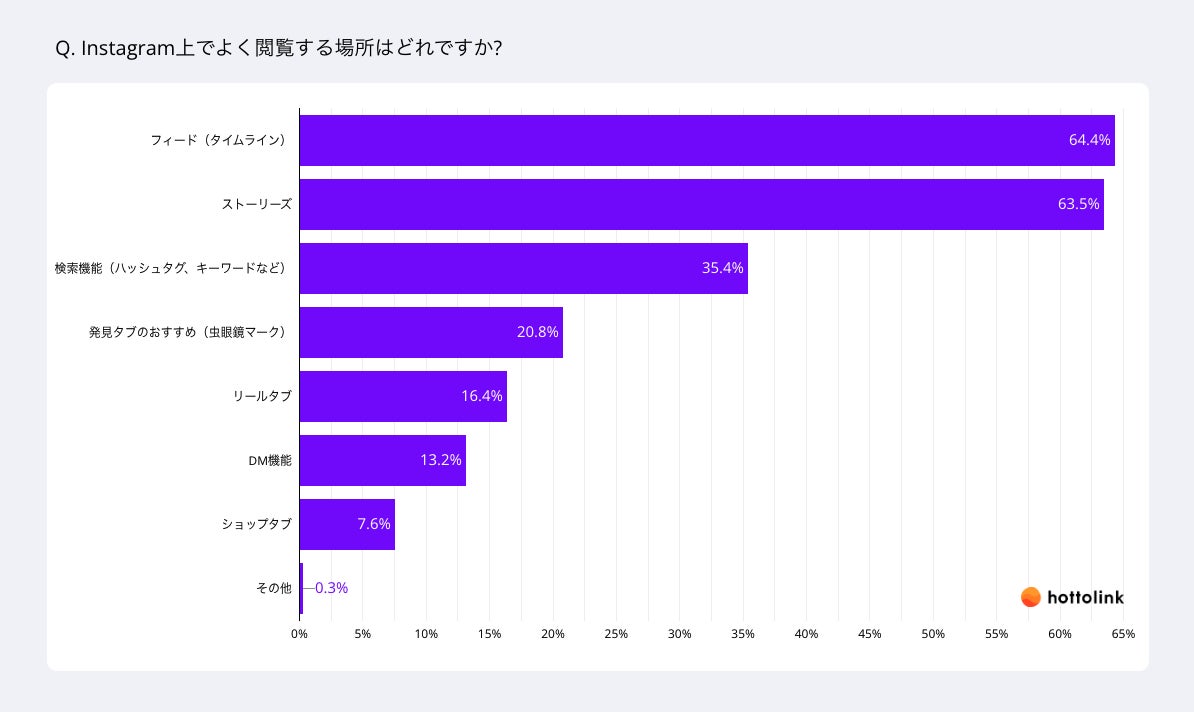 よく閲覧する場所について聞いたところ、「フィード(タイムライン)」が64.4%、「ストーリーズ」が63.5%でした。