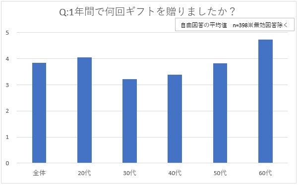 「2021年の1年間で何回ギフトを贈りましたか」と聞いたところ、最もギフトを贈っていたのは60代以上でした。続いて20代のギフトが活発です。贈ったギフトの回数は全体平均で3.8回でした。