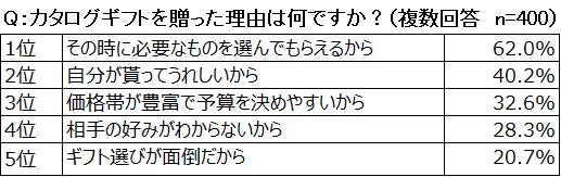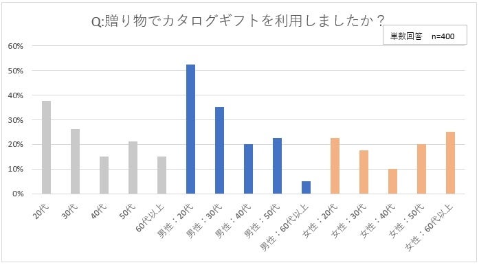 「贈り物でカタログギフトを利用しましたか」と聞いたところ、20代の利用率が37.5%で最も高くなりました。引き出物や内祝いのイメージが強いカタログギフトですが、若い世代ではさまざまなお祝いに利用されているようです。特に20代男性は52.5%と半数以上が利用しており、60代以上以外は、女性よりも男性が好む傾向にあります。「カタログギフトを贈った理由」は、「その時に必要なものを選んでもらえるから」が62.0%で、贈る相手が好きなものを選んでほしいという想いが最多となりました。