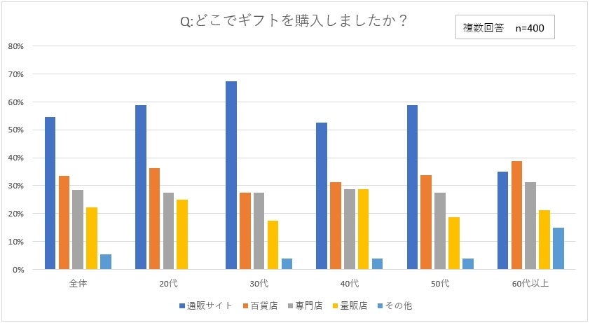 「どこでギフトを購入しましたか」と聞いたところ、54.5%が「通販サイト」と回答し、「百貨店」の33.5%を大きく上回りました。